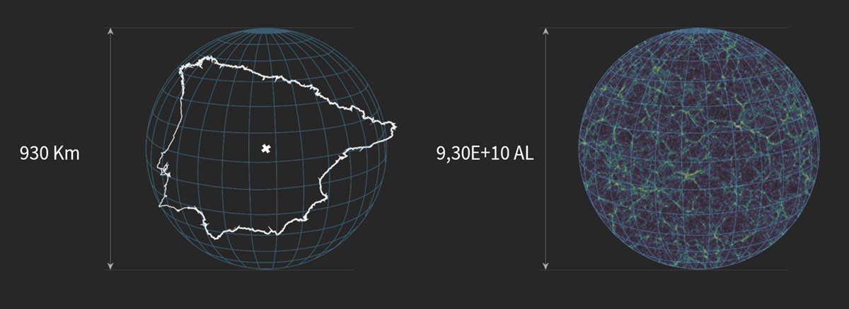 Esto es, cada kilómetro de la península ibérica equivale a 100 millones de años luz en el universo observable.